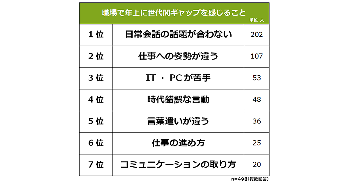 次に「職場で年上に世代間ギャップを感じること」を聞くと、1位は「日常会話の話題が合わない」202人が圧倒的多数だった。以下「仕事への姿勢が違う」107人、3位「IT・PCが苦手」53人が続く。なお年上世代に通じなかった言葉としては「SNS」「EC」などがあがったという。