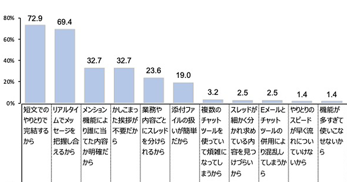 さらに少数だが「複数のチャットツールを使っており煩雑になる」「スレッドが細かく分かれ求めている内容を見つけづらい」「Eメールとチャットツールの併用により混乱してしまう」といった声もあがっている。
