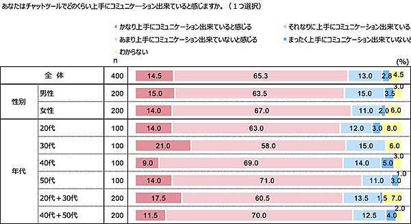 さらに深掘りのため、「相手との意思疎通という点で、上手にコミュニケーション出来ているか」を聞くと、「かなり上手にコミュニケーション出来ている」14.5%、「それなりに上手にコミュニケーション出来ている」65.3%計で、約8割を占めた。特に30代はその比率が高い。