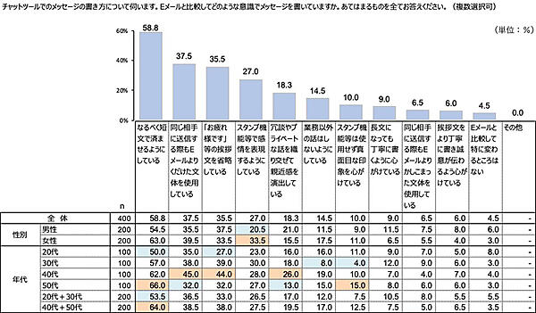 一方、「Eメールと比較して、書き方に違いがあるか」を聞くと、「なるべく短文で済ませるようにしている」58.8%という人が半数を超えた。特に年齢があがるほどその傾向が強い。「同じ相手に送信する際もEメールよりくだけた文体を使用している」37.5%というヒットも多い。