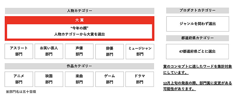 - 【調査カテゴリ】「人物カテゴリー(5部門)」「作品カテゴリー(5部門)」「プロダクトカテゴリー」「都道府県カテゴリー」など