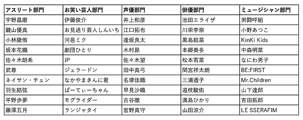 今回「人物カテゴリー」の上位候補者50名が、10月20日に先行発表された。顔ぶれは以下のとおりだ(各部門10名・順不同)。なお2022年1月1日~9月1日の1日あたり平均検索数が、前年と比べ増加した人物から選出されている。
