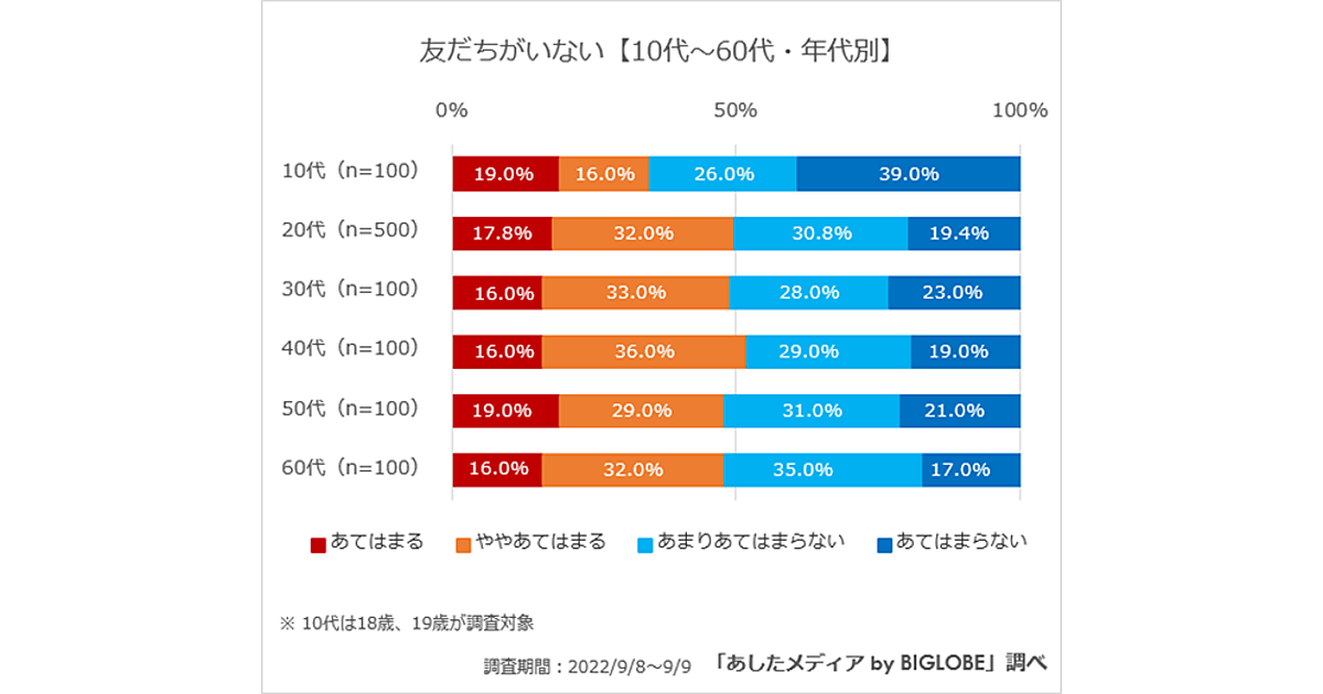 友だちがいるかいないか、20代~60代ではほぼ真っ二つに分かれる