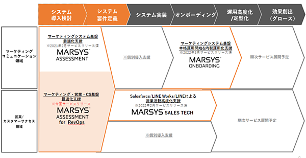 マーケティングコミュニケーション・営業・カスタマーサクセス領域で課題の抽出と対応策提言を行うサービス。戦略面の連携、システム導入・活用、業務フローの改善につなげ、企業の収益最大化と仕組みの最適化を後押しする。企業と顧客の接点に関するコンサルティング・アウトソーシングサービス事業のバーチャレクス・コンサルティングと協業して展開する。