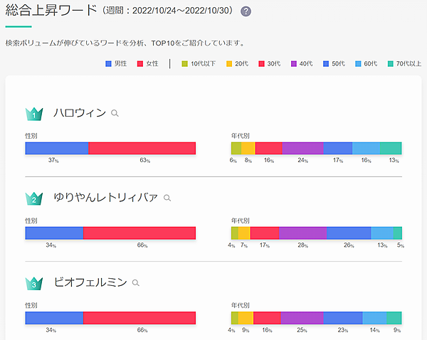 ヤフーは、検索数の急上昇ワードや、キーワードを検索しているユーザーの性・年代別の傾向を掲載するサービス「DS.GALLERY」を11月8日に始めた、と同日発表した。世の中で関心を持たれていることや話題のモノを手軽に知ることができる。検索データの面白さを多くのユーザーに感じてもらう契機にするために公開する。