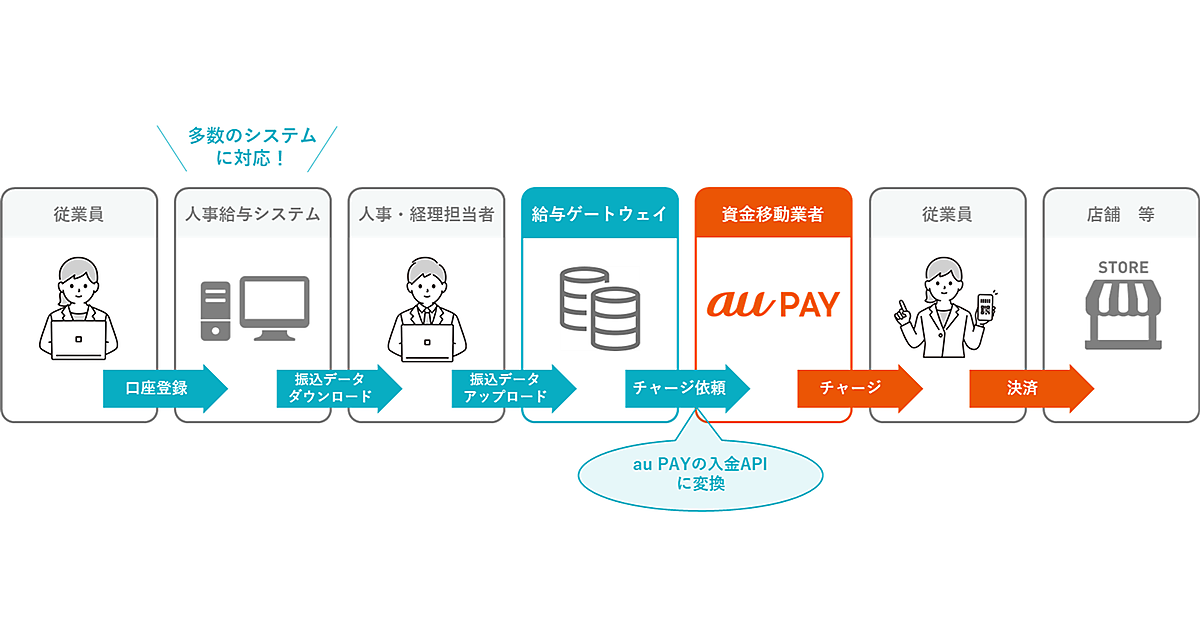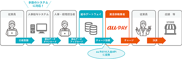 給与のデジタルマネー払い解禁に向けた対応となり、労働基準法の省令改正を見据えた。省令改正で必要な許認可取得などの準備が整えば、企業は給与デジタルマネー払いゲートウェイサービスを経由することで、従業員に対してau PAYで給与が支払えるようになる。従業員はこれまでのように銀行口座から給与を現金で引き出すことなく、すぐau PAYの決済に利用できる。