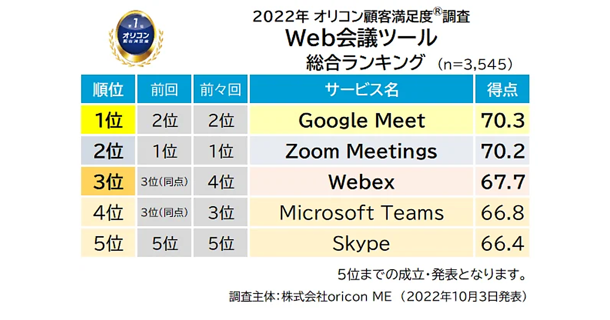 oricon ME(オリコン)は、「Web会議ツール」「ビジネスチャットツール」の満足度調査の結果を発表した。2020年よりスタートし、今年2022年で3回目。