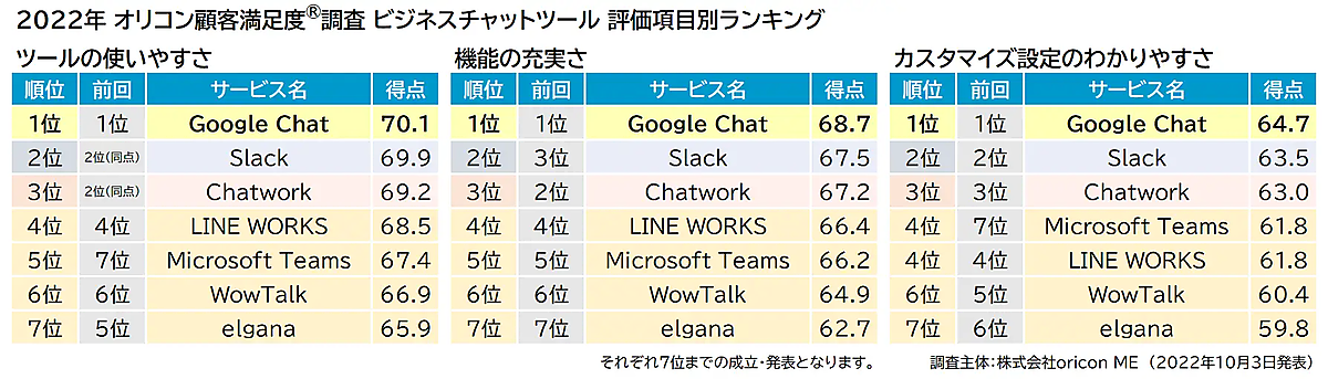 その結果1位は、前年に続き「Google Chat」(グーグル)69.3点となった。項目別でもすべて1位を記録している。
