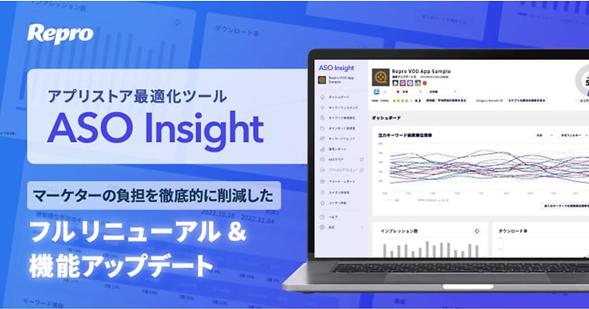 ウェブとアプリの収益最大化サービスを手掛けるRepro(リプロ)は、同社が展開するアプリストア最適化(ASO)ツール「ASO Insight」を全面リニューアルした、と11月9日発表した。ASOの業務の負担軽減と利便性向上を目指し、データ基盤を刷新するとともに、UI(ユーザーインターフェース)一新した。加えて、必要な機能を整理してアップデートした。