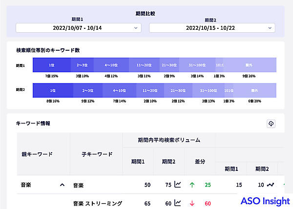 機能のアップデートは①2期間比較の追加②複合語キーワードテーブルの追加③集計粒度の多様化④文字数フィルター--の4つ。①は、2つの期間を指定してキーワードの検索順位やダウンロード数の変化の比較を可能にした。キャンペーン前後の変化が集計作業の手間なしで把握できる。②は親キーワードと子キーワードを自動分類して集計・表示する。