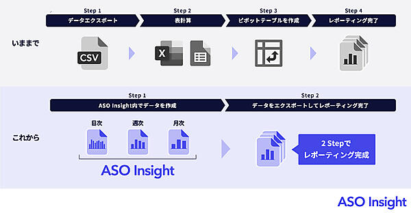 ASOは、アプリストアの各種設定を最適化してアプリのダウンロード数を増やす施策。ASO InsightはASO施策の実施と効果測定の簡易化・自動化を可能にする。今回のデータ基盤の刷新によってデータの読み込み・処理速度を大幅に改善し、より快適にした。UIは、業務工程と活用時の導線に合わせて機能を再設計・再配置して視認性と利便性を高めた。