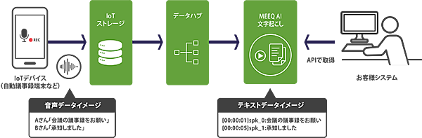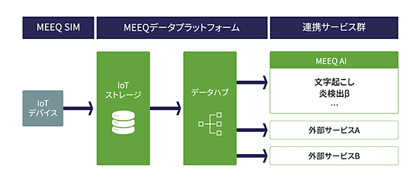 IoT機器から同社のノーコードIoT・DXプラットフォーム「MEEQ」の閉域ネットワークを経由してIoTストレージに音声ファイルを送信すると、AI機能がテキスト化したデータを得られる。MEEQは、直感的なコンソール画面で簡単にIoT向け通信サービスの購入・決済・登録・管理が可能なシステム。IoT回線が容易に追加できる仕組み「MEEQ SIM」を利用する。
