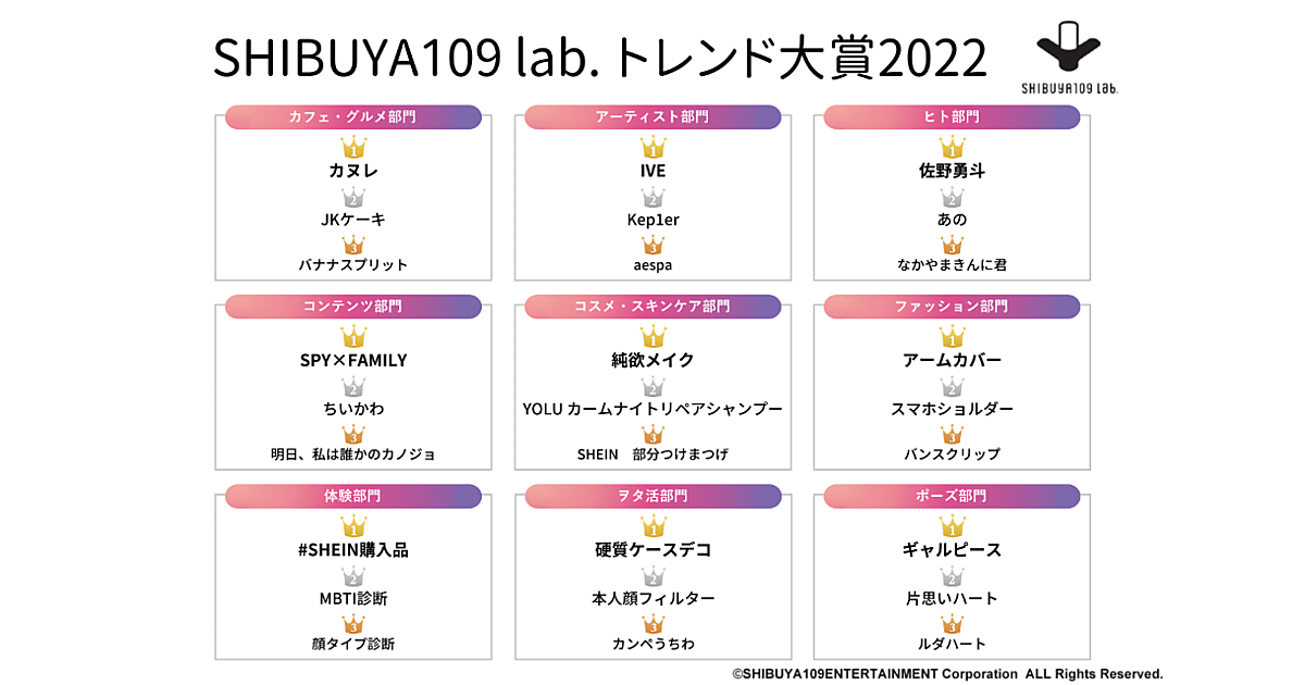 SHIBUYA109エンタテイメントが運営する若者マーケティング研究機関「SHIBUYA109 lab.(シブヤイチマルキューラボ)」は、around20(15~24歳)の女性564人を対象に、2022年のトレンド調査を実施した。