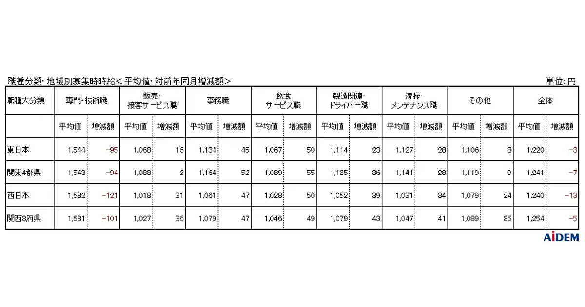 関西3府県全体の平均時給は、前年同月比5円減の1,254円。職種大分類別の平均時給は、「専門・技術職」1,581円(前年同月比101円減)、「事務職」1,079円(同47円増)、「製造関連・ドライバー職」1,079円(同43円増)、「清掃・メンテナンス職」1,047円(同41円増)、「飲食サービス職」1,046円(同49円増)、「販売・接客サービス職」1,027円(同36円増)の順となった。