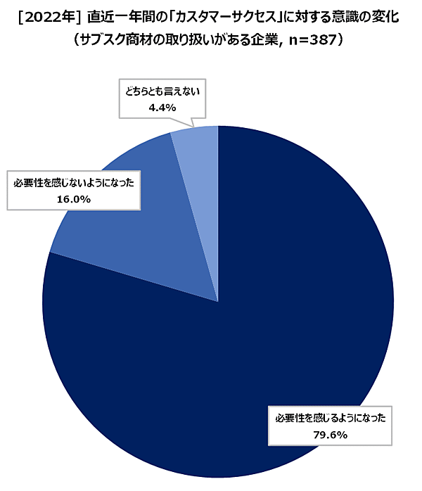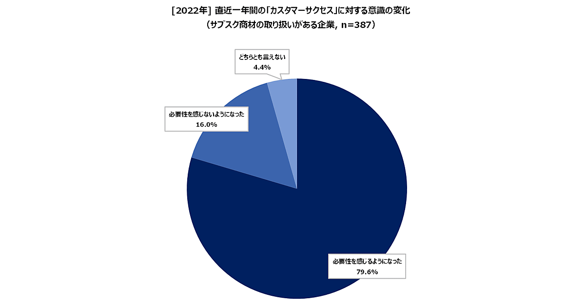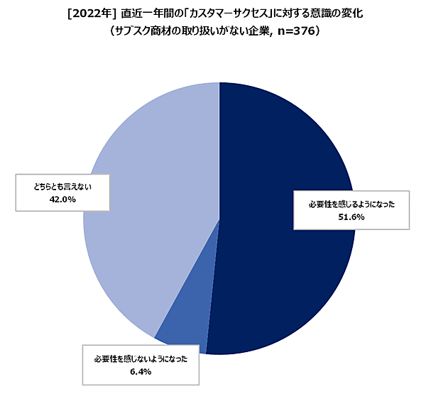 さらに、サブスク商材の扱いがあると回答した387人に「直近一年間でのカスタマーサクセスに対する意識の変化」を聞くと、「必要性を感じるようになった」79.6%だった。一方サブスク商材の取り扱いがないと回答した376人に同じく「意識の変化」を聞くと、「必要性を感じるようになった」51.6%と半数を超えており、動向を注目しているのは間違いないようだ。