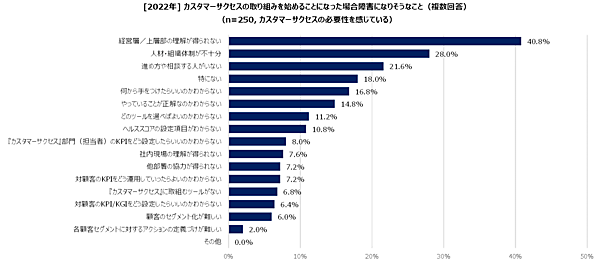 まず「カスタマーサクセス(能動的な顧客サポート)」について、必要性を感じている250人に対し「カスタマーサクセスの取り組みを始める場合、障害になりそうなこと」をあげてもらうと、「経営層/上層部の理解が得られない」40.8%が圧倒的多数だった。前年には20.0%だったため、1年で倍以上になったこととなる。これに「人材・組織体制が不十分」28.0%、「進め方や相談する人がいない」21.6%が続き、人的な問題が浮き彫りとなった。