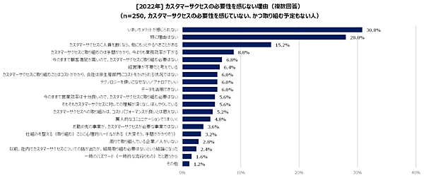 次に、現在カスタマーサクセスに取り組んでおらず、今後も取り組む予定はないかつ必要性も感じていないという250人にその理由を聞いた。その結果「いまいちメリットを感じられない」30.8%、「特に理由はない」28.0%が特に多かった。