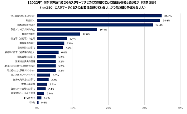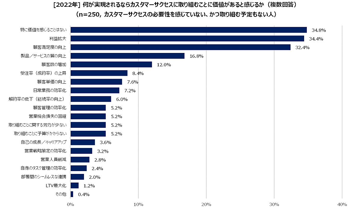 続いて「何が実現されるならカスタマーサクセスに取り組むことに価値があると感じますか?」と聞くと、「特に価値を感じることはない」34.8%が最多で、「利益拡大」34.4%、「顧客満足度の向上」32.4%を上回った。取り組み前から見切っているのが現状で、これらは前年とほぼ同じ数値だ。