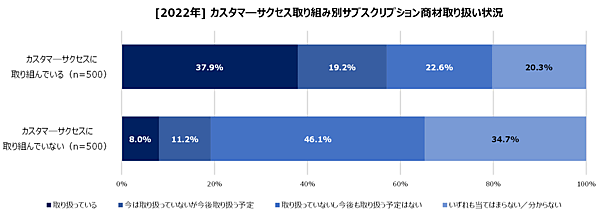 カスタマ―サクセスに取り組んでいる企業・取り組んでいない企業に「勤務先でサブスクリプション(サブスク)型の製品またはサービスについて取り扱いがあるか」を聞くと、取り組み企業では37.9%、非取り組み企業では8.0%がサブスク商材を取り扱っていた。カスタマ―サクセスとの親和性がうかがえる。