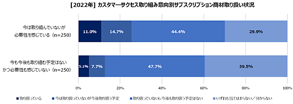 一方で「カスタマ―サクセスの取り組みは行っていないし今後も必要ないと考えている人」も一定数存在し、こうした企業の47.7%が「サブスク商材を取り扱っていないし今後も取り扱う予定はない」と回答している。