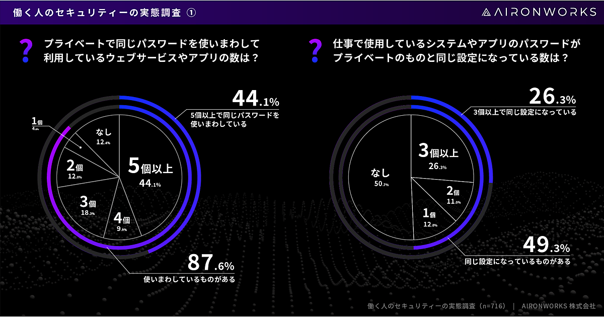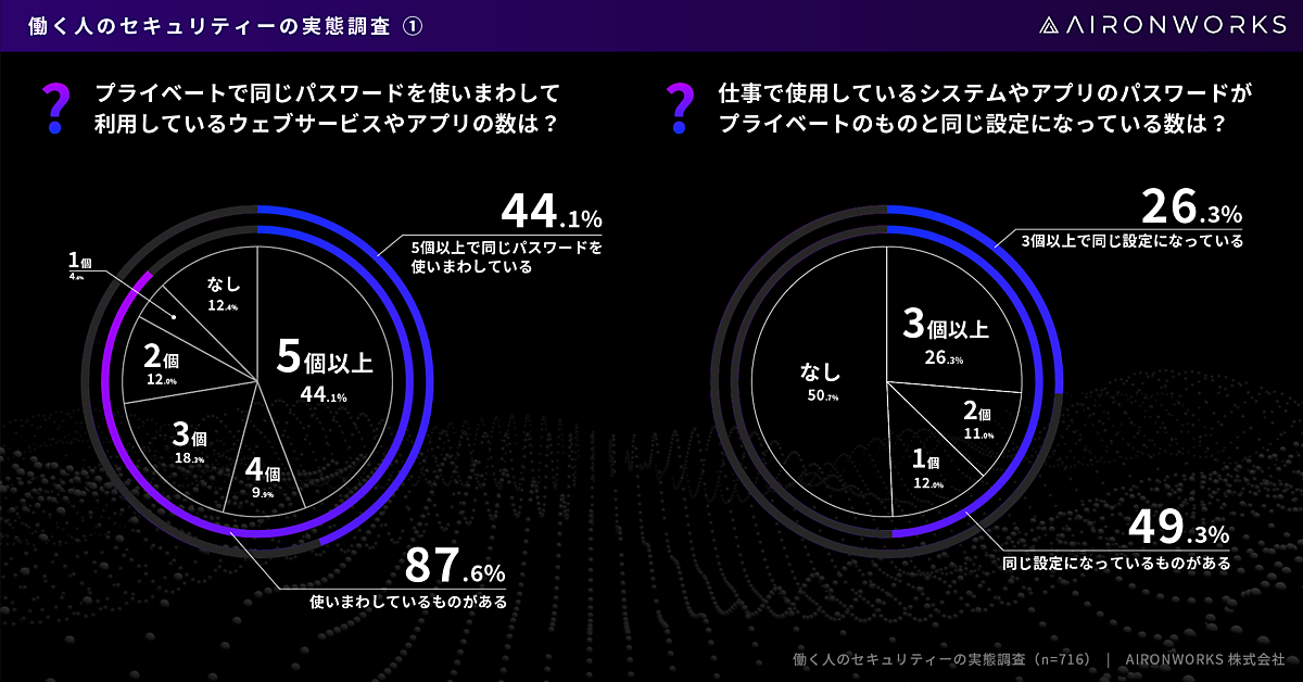 まず“プライベートで利用しているウェブサービス・アプリ”において「パスワードを使い回している」としたのは87.6%。「5個以上のサービス・アプリで、使い回しているものがある」は44.1%で半数近くを占めた。「4個」の9.9%を加えると、半数を超える。
