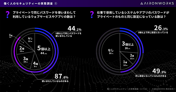 また“仕事で利用しているウェブサービス・アプリ”において「プライベートと同じパスワードを使い回している」とした人は49.3%。個人と業務では使い分けをいちおう意識しているようだが、それでもほぼ半分に達している。そして「3個以上で同じ設定になっている」が26.3%と特に多い。