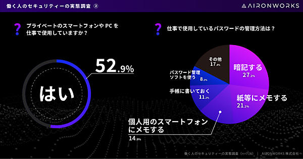 そこで「仕事で利用するシステム等のパスワードの管理方法」を聞くと、「暗記する」27.2%、「紙等にメモする」21.2%、「個人のスマホにメモする」14.9%、「手帳に書いておく」11.2%と、セキュリティ的に脆弱な方法、個人と業務が混在した方法が上位となり、「パスワード管理ソフトを使う」は8.1%でこれらを下回っている。