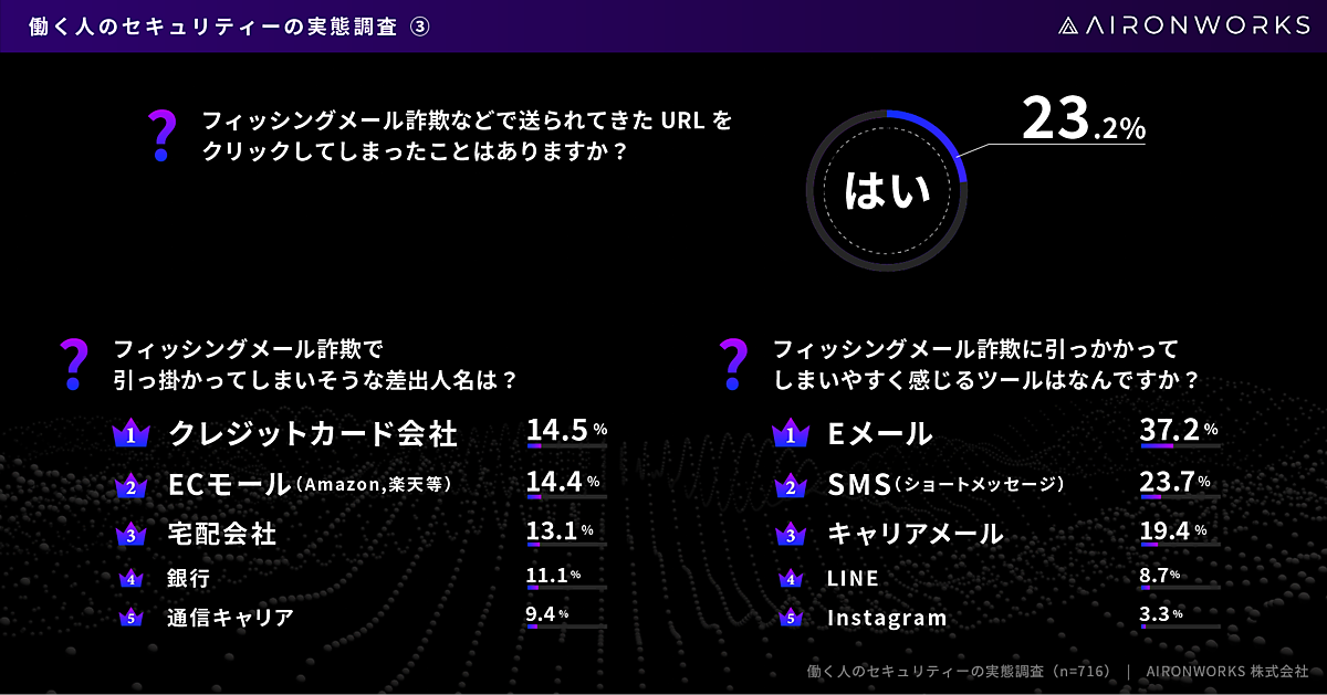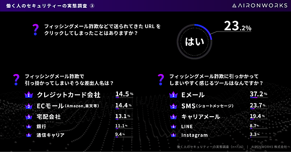 AironWorksは、「フィッシングメール・サイバーセキュリティ」の実態に関する調査結果を発表した。10代~70代の全国男女716人が回答している。