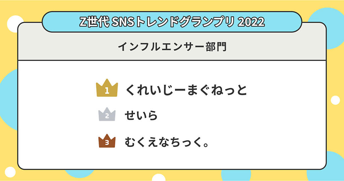 『Z世代SNSトレンドグランプリ2022』では、各ジャンル上位3組が公表されている。