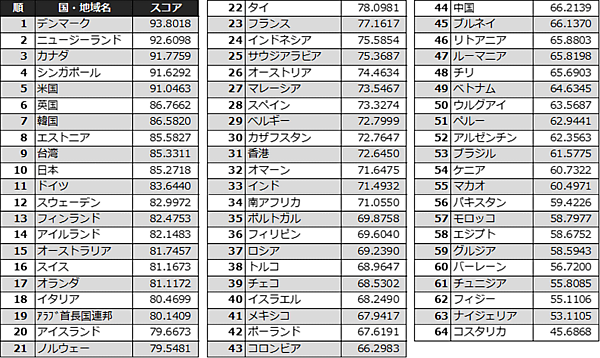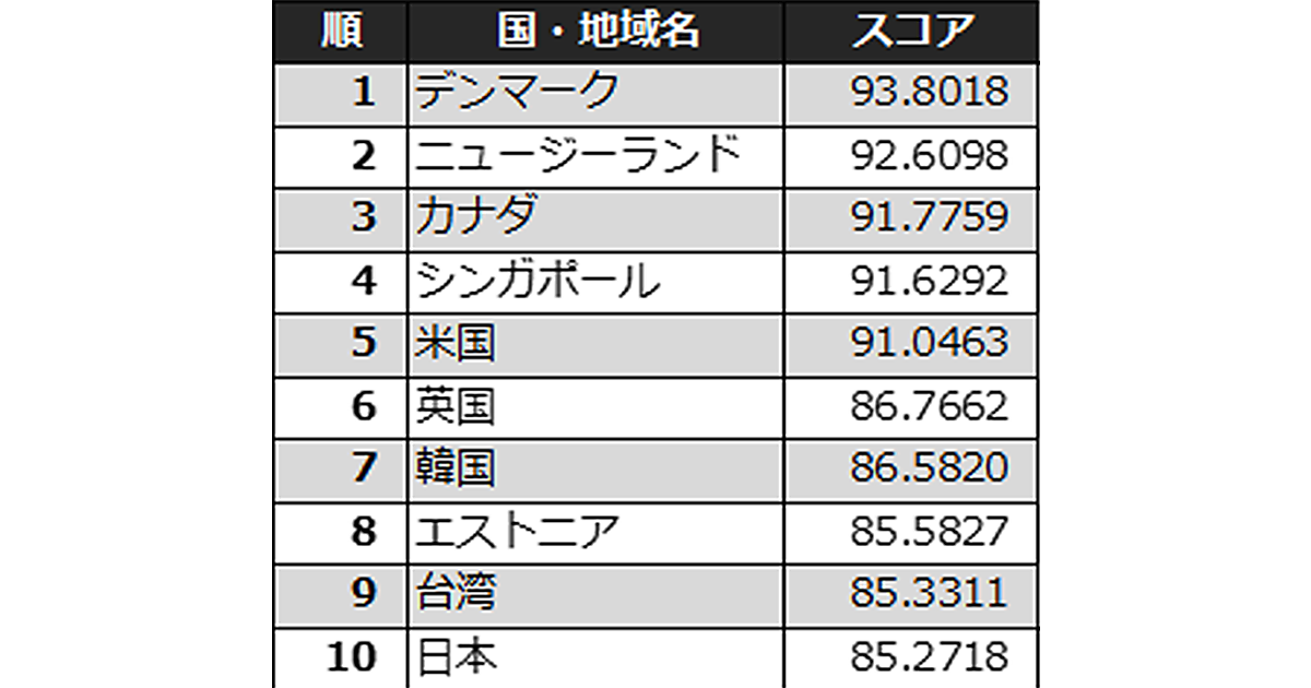 デンマークは2年連続で1位となり、ニュージーランドは昨年から躍進し初めて2位にランクインした。米国(5位)と英国(6位)との間には約4ポイントの開きがあり、ICT先進国の中でも格差があることがわかる。また、昨年度9位の日本は昨年度10位の台湾と逆転し、ランクを一つ落とす形となった。