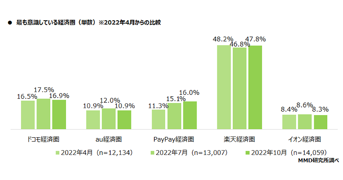 MMD研究所は「2022年10月経済圏のサービス利用に関する調査」を実施した。予備調査では25,000人、本調査では5つの経済圏(ドコモ経済圏、au経済圏、PayPay経済圏、楽天経済圏、イオン経済圏)のメイン利用者2,500人が回答している。