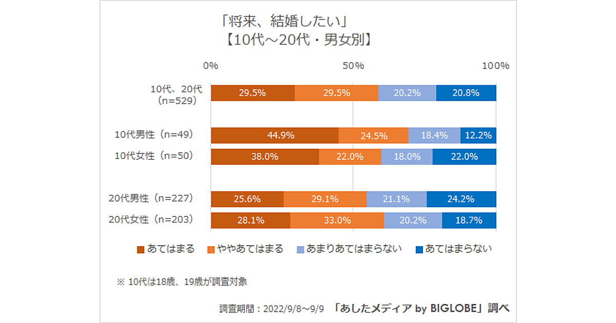 まず18歳~29歳(若年層)の男女600人のうち未婚の男女529人に「将来、結婚したいか」を聞くと、「あてはまる」29.5%、「ややあてはまる」29.5%で、結婚を望んでいる若年層は6割未満にとどまる。「あてはまる」の数値は10代男性(44.9%)に比べ20代男性(25.6%)は大きく減少する(結婚願望が低い)傾向が見られた。女性も減少するがここまで大きくはない。