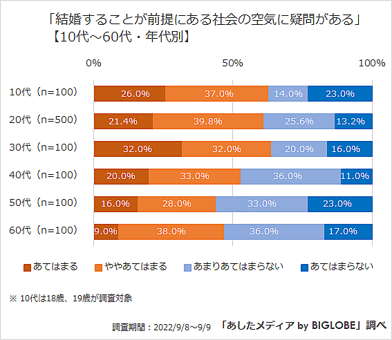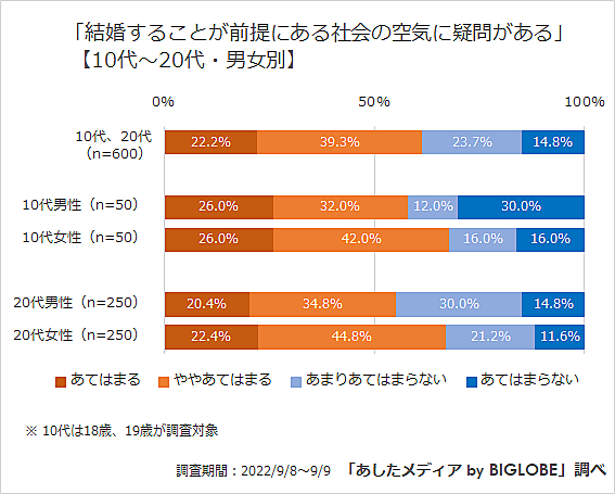 そこで「結婚することが前提にある社会の空気に疑問があるか」を聞くと、「あてはまる」22.2%、「ややあてはまる」39.3%で6割を超えた。“結婚への疑念”が“結婚願望”を上回った形だ。また男女別では、女性のほうが懐疑的なことが判明した。