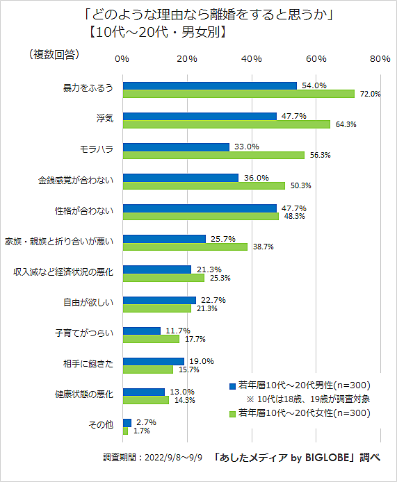 そこで18歳~29歳(若年層)の男女600人に「どのような理由なら離婚をすると思うか」を聞くと、男性は「暴力をふるう」「性格が合わない」「浮気」がトップ3、女性は「暴力をふるう」「浮気」「モラハラ」がトップ3だった。
