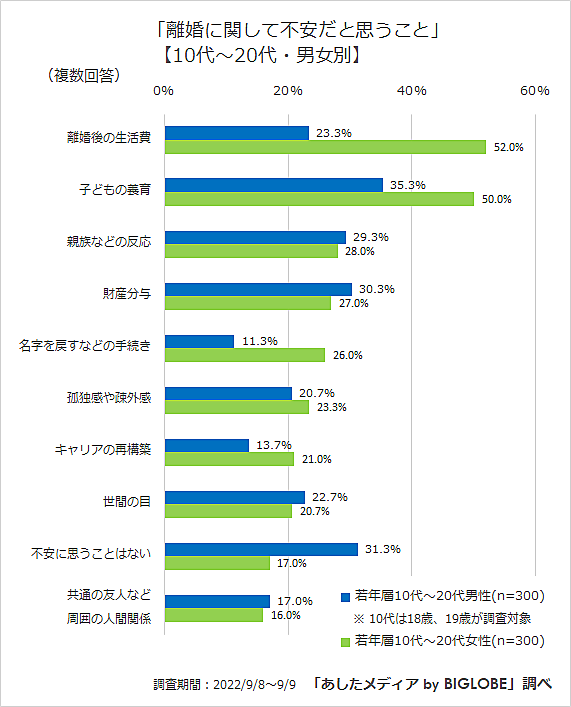 あわせて「離婚に関して不安だと思うこと」を聞くと、男性は「子どもの養育」35.3%がトップだが、女性は「離婚後の生活費」52.0%がトップで、それに並んで「子どもの養育」50.0%が続いた。女性は「苗字を戻すなどの手続き」「キャリアの再構築」が男性より高く、離婚の非対称性がうかがえる。