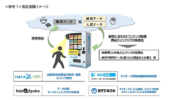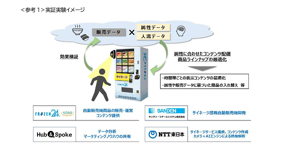 AI(人工知能)カメラの映像解析技術を活用したデータと冷凍自販機の商品販売データ分析を基に、有用性を調べる。冷凍自販機サービス「FROZEN24」を展開するSOBOが同自販機「ど冷えもん」での商品販売・運営とサイネージで流すコンテンツを提供。ハブアンドスポークはデータの分析と商品スケジュールなど、サンデンRSはど冷えもんのサイネージ対応機種の開発を担当する。