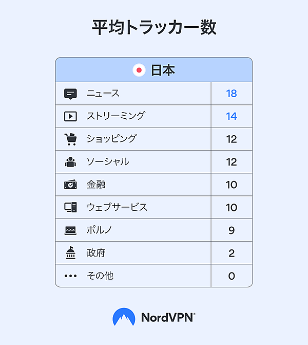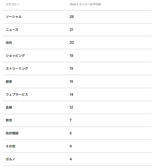 この調査によると、日本のWebサイトには平均13のトラッカーがあり、データを収集し収益化していた。ジャンル別に見ると、平均トラッカー数は「ニュース」で特に多く、平均18まで上昇する。以下「ストリーミング」14、「ショッピング」12が続いた。なお発見されたトラッカーのほとんどは、約30%がGoogle、11%がFacebook、7%がAdobeのトラッカーだったという。