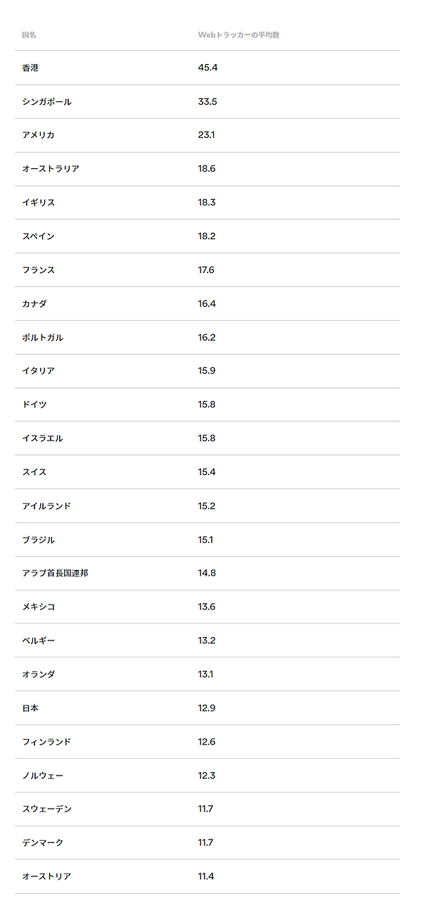 国・地域別で見ると「香港」45.4が圧倒的に多い。以下「シンガポール」33.5、「アメリカ」23.1が続く。国・地域のトラッカー数の差は、各国のデータ保護法の影響が高いと考えられる。アメリカには、全州で全種類データのプライバシーをカバーする単一法律はないが、中欧・北欧ではEU一般データ保護規則(GDPR)が適用される。アメリカよりもトラッカー数が少ないのもそのためだ。