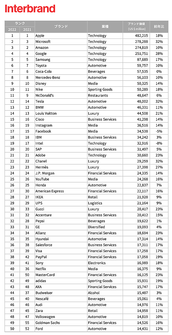 インターブランドは、「Best Global Brands 2022」レポートを発表した。グローバルに事業展開を行うブランドを対象に、そのブランドが持つ価値を金額(USドル)に換算してランキング化している。同調査は2000年からスタートし、今回2022年で23回目。今回調査から、環境・社会・ガバナンス(ESG)に関するデータも加味している。