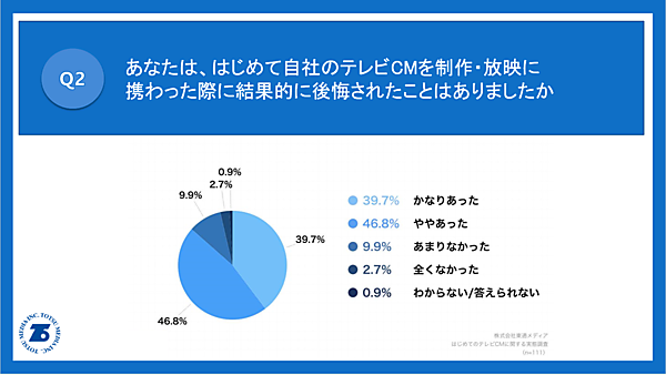 一方「初めて自社のテレビCMを制作・放映に携わった際、結果的に後悔したことがあるか」を聞くと、「かなりあった」39.7%、「ややあった」46.8%と、86.5%(96人)もの担当者が後悔を抱えていた。