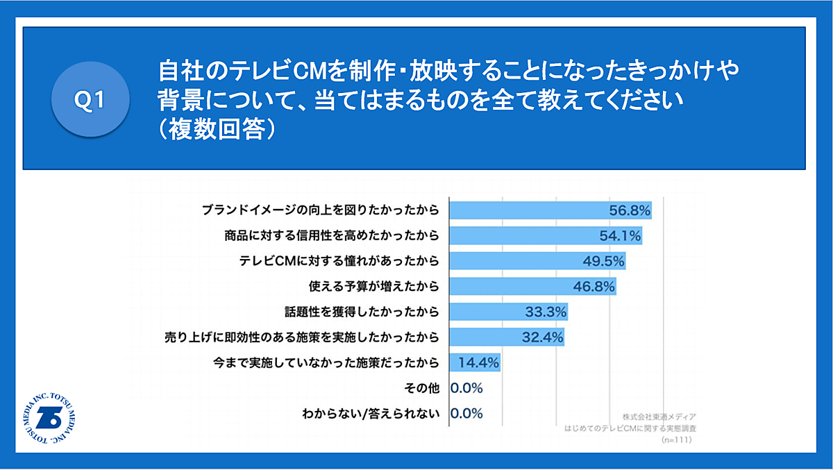 まず「自社のテレビCMを制作・放映することになったきっかけや背景」を聞くと、「ブランドイメージの向上を図りたかったから」56.8%、「商品に対する信用性を高めたかったから」54.1%、「テレビCMに対する憧れがあったから」49.5%が上位だった。「わからない/答えられない」といった担当者はゼロで、かなり明確な目的設定をしてテレビCMを打っていることがわかる。