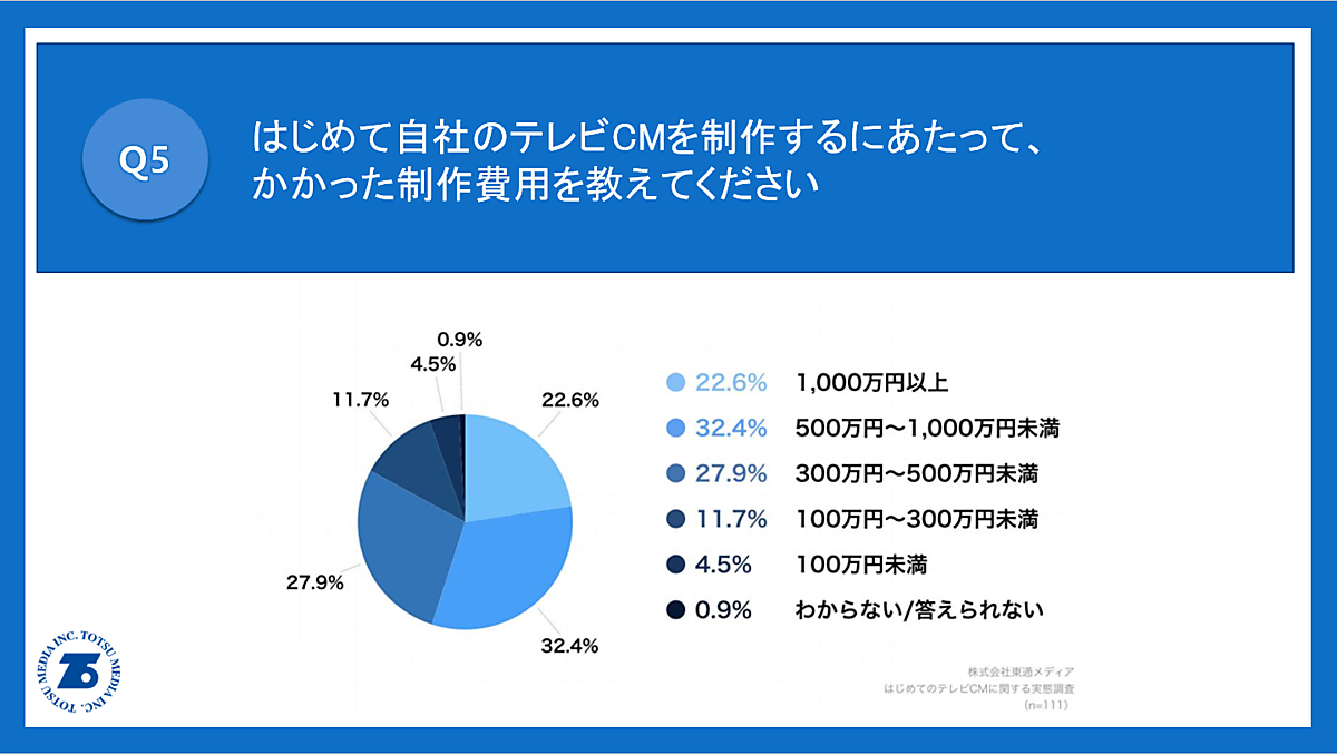 「初めての自社テレビCMでかかった制作費用」については、「1,000万円以上」22.6%、「500万円~1,000万円未満」が32.4%で、500万円が分かれ目のようだ。