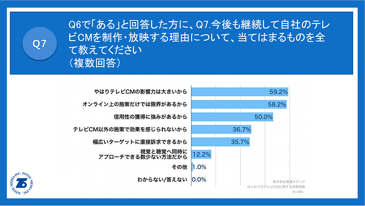 なお「今後もテレビCMの制作・放映を継続実施する」という企業は88.3%。その理由は「やはりテレビCMの影響力は大きいから」59.2%、「オンライン上の施策だけでは限界があるから」58.2%、「信用性の獲得に強みがあるから」50.0%といった声があがった。