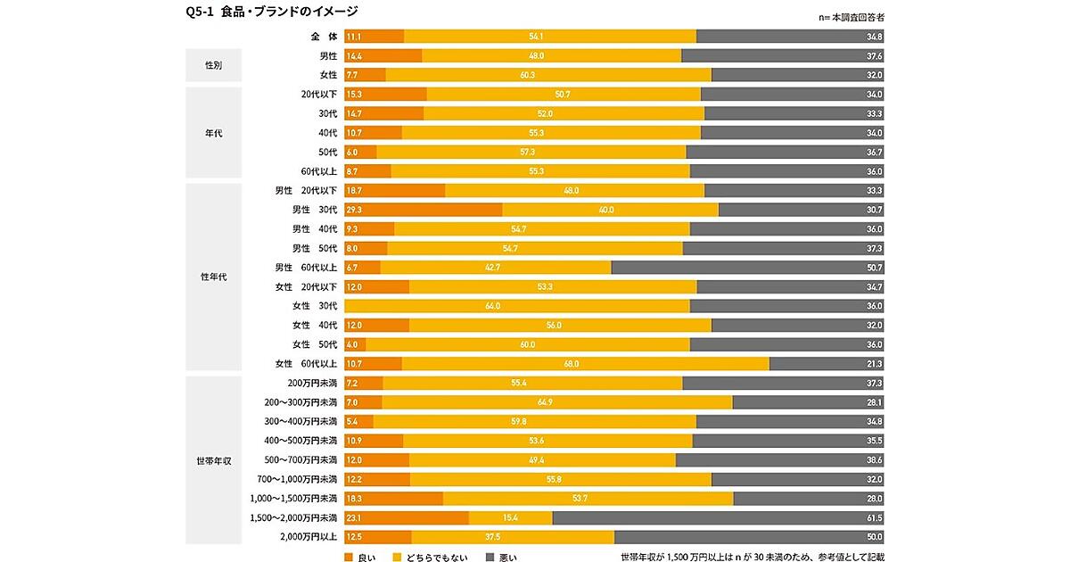 製造メーカー、販売店におけるイメージでは、食品・ブランドに対するものと大きな違いはなかったが、販売店については全体的に「どちらでもない」が多い傾向だった。