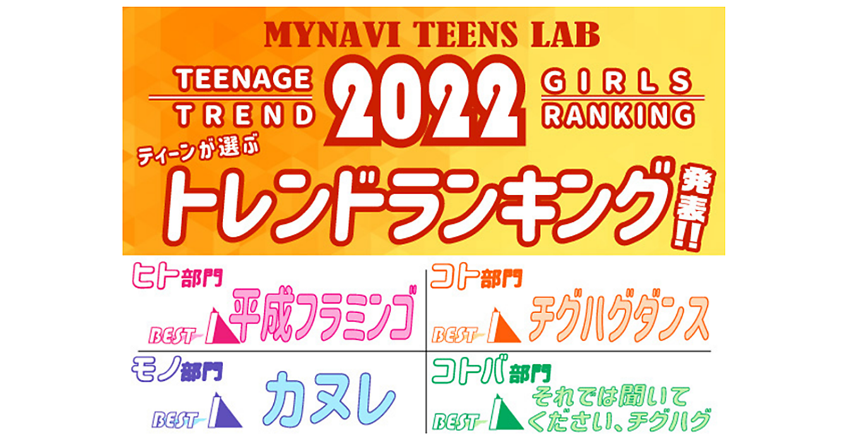 マイナビが運営するマイナビティーンズラボは、「2022年ティーンが選ぶトレンドランキング」を発表した。2022年に流行した「ヒト」「モノ」「コト」「コトバ」の4ジャンルについて、13~19歳の女性633名が回答している。「ティーンが選ぶトレンドランキング」は2015年から行っており、今年で8年目。