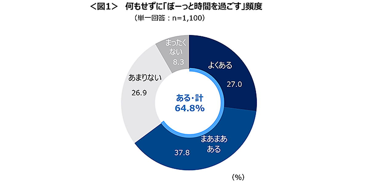 まず「何もせずに時間を過ごすことがあるか」を聞くと、「よくある」27.0%、「まあまあある」37.8%で、計64.8%が“ぼーっと時間”を過ごしていた。