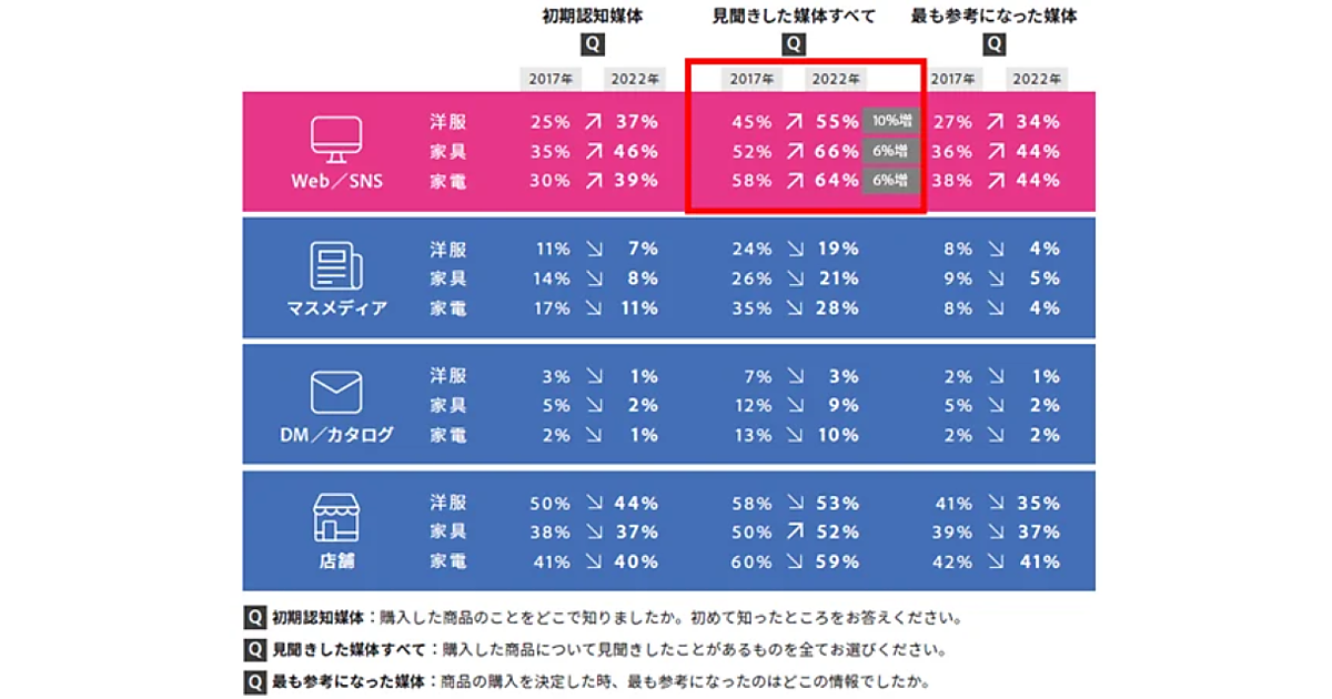 2017年の調査と比較して、商品の初期認知・情報収集・購入決定に対する「Web/SNS」の影響力は拡大しており、マスメディアやDM、店舗が顧客接点となっている割合は全体的に下がっていた。