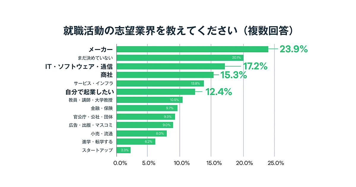 まず就活における志望業界を聞くと、「メーカー」が23.9%と最も多く、2位は「まだ決めていない」で20.1%、以下「IT・ソフトウェア・通信」「商社」と続いた。また、12.4%の学生が「自分で起業したい」と回答していた。