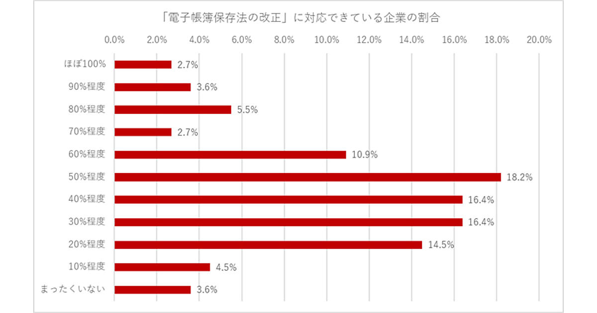 まず担当しているクライアントの主流は、個人事業主や小規模事業者が7割近くを占める。これらクライアントの「電子帳簿保存法の改正」への対応度合いを聞くと、「まったくいない」3.6%から「ほぼ100%」2.7%まで千差万別だが、最も多かったのは「50%程度」18.2%だった。7割以上が5割以下の対応にとどまっている。