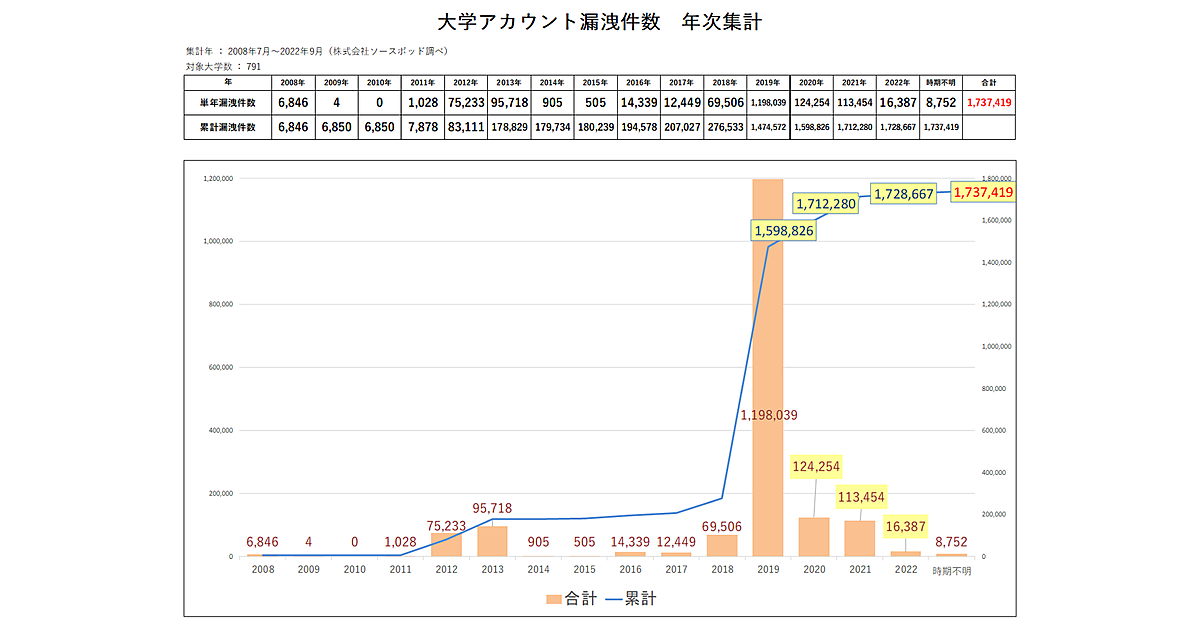 国内791大学のドメインアカウントを対象に、2022年9月末時点のデータを集計した結果、期間内の累計漏えい件数は約173万件だった。2021年は歴代3位となる約11万3,000件の漏えいが確認されていたが、2022年は漏えい件数としては約1万6,000件と低水準だが、頻度・被害規模面で見ると2021年と同等に推移し、歴代最高水準に達する可能性が指摘された。ひと月あたり178.4大学が漏えい事案を起こしており、不正アクセスも引き続き多発している。